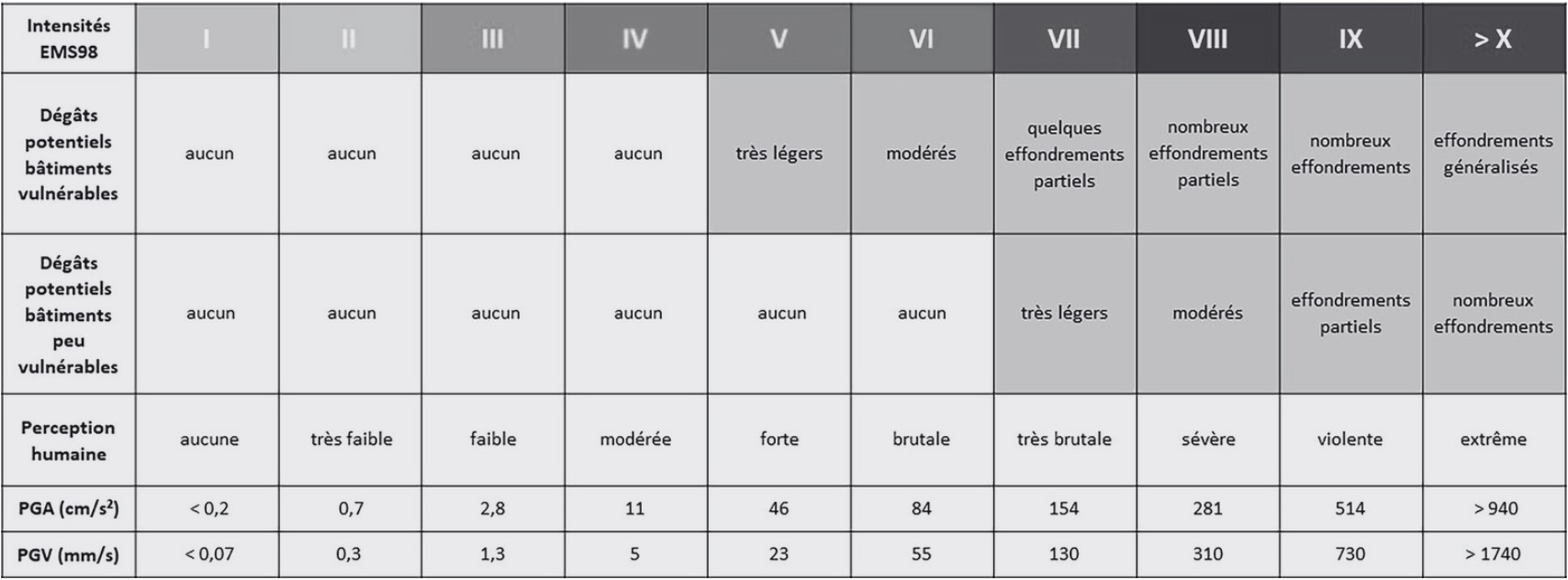 On utilise l’échelle EMS-98 (European Macroseismic Scale), qui va de I à XII. - Qu’est-ce que le PGV (Peak Ground Velocity) ?